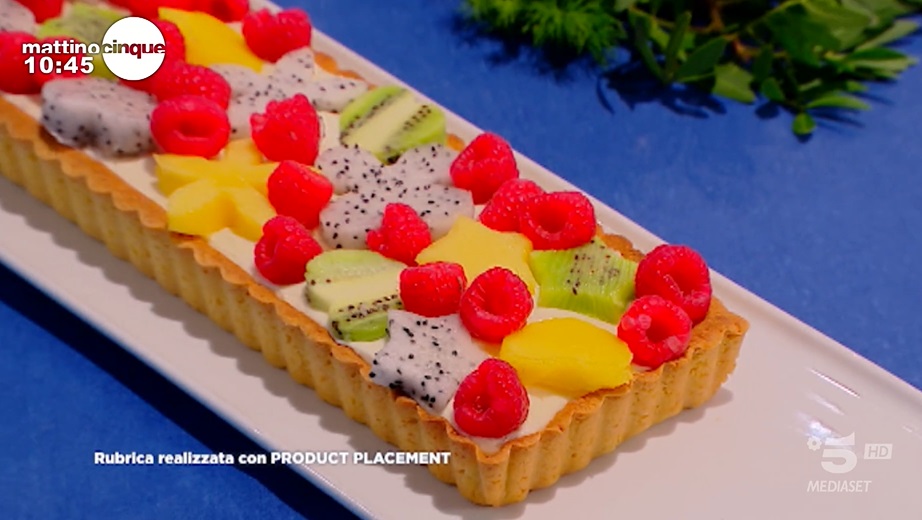 - 1 panetto di pasta frolla, 250 g mascarpone, 150 g lamponi, 2 kiwi, 1 mango, 1 frutto del drago, 100 ml crema di cocco, 50 g zucchero a velo, vaniglia