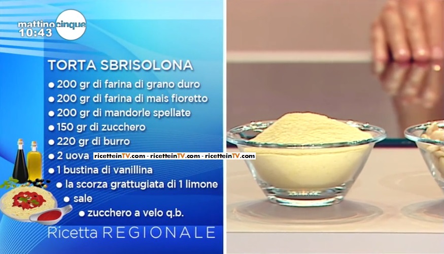 torta sbrisolonaSamya Abbary, l’attrice marocchina che propone, all’interno di MattinoCinque, le sue ricette, quest’oggi ha preparato un dolce dell’antica tradizione dolciaria mantovana. Una torta golosa e genuina. Ecco la ricetta della torta sbrisolona.