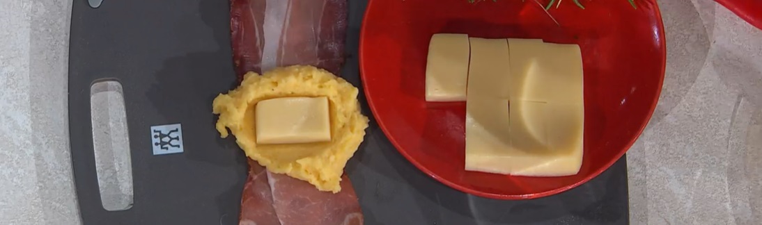Stendiamo le fette di speck a due a due, disponiamo in mezzo un po’ di composto di patate, sopra un pezzo di formaggio filante e chiudiamo le fette di speck ad involtino. Avvolgiamo ogni pacchetto, orizzontalmente, con un’altra fetta di speck, ottenendo così i medaglioni.