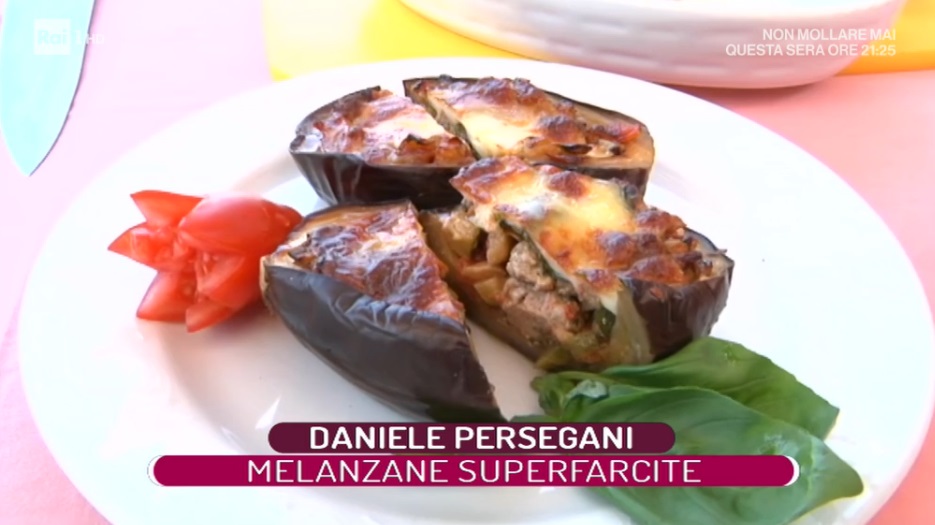 Tritiamo la polpa scavata dalle melanzane con il coltello. La mettiamo a soffriggere in padella con un filo d’olio e le altre verdure a cubetti piccoli: cipollotto, peperoncini dolci, zucchine, rabarbaro (o sedano), pomodori. Devono rosolare, ma rimanere croccanti.