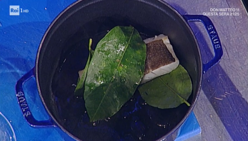 Saliamo e pepiamo i tranci di merluzzo. Lasciamo riposare per 10 minuti. Scaldiamo una padella con un filo d’olio ed una spolverata di sale. Mettiamo a cuocere il merluzzo, adagiandola dalla parte della pelle. Dopo un paio di minuti, quando la pelle è dorata, lo rigiriamo e facciamo cuocere 30 secondi. Lo togliamo e lo avvolgiamo nelle foglie di limone. Lo mettiamo in una pentola con un filo d’olio e 2-3 cucchiai di brodo vegetale o acqua. Inforniamo a 180° per 8 minuti.