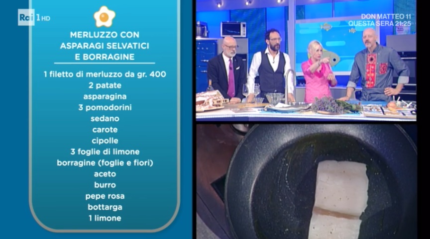In un’altra padella, facciamo soffriggere un trito di sedano, carota e cipolla. Aggiungiamo le patate lesse a cubetti piccoli, asparagini appena scottati in acqua, pomodorini a metà e qualche foglia di borragine. Saltiamo per qualche minuto a fiamma vivace. Mettiamo il tutto alla base di un piatto. Adagiamo sopra il merluzzo e lo irroriamo con il fondo di cottura al burro. Finiamo con una spolverata di bottarga e fiori di borragine.