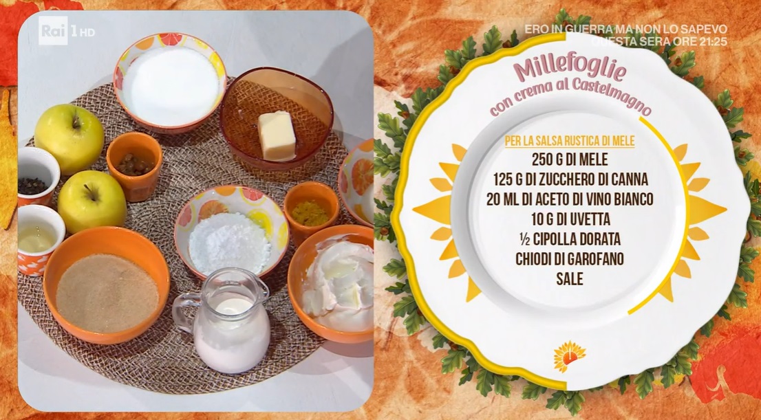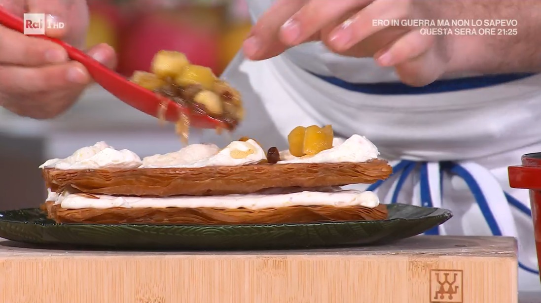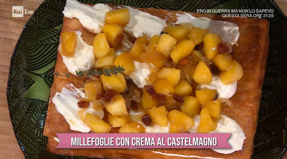 Componiamo: su uno strato di sfoglia, formiamo uno strato di crema al castelmagno. Sovrapponiamo la seconda sfoglia, quindi finiamo con ciuffi di crema e la confettura di mele e cipolle.