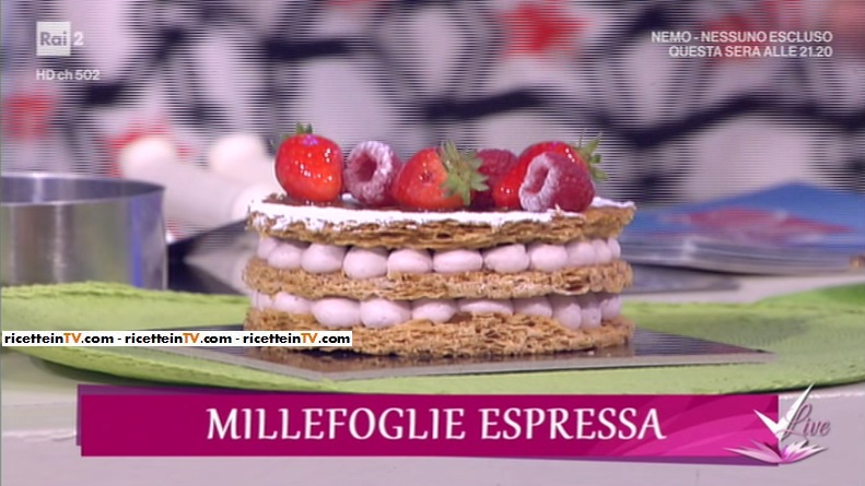 Con un anello del diametro di 14 cm, ricaviamo 3 dischi dalla sfoglia caramellata. Creiamo dei ciuffi di panna ai lamponi sul bordo del primo disco di sfoglia e farciamo l’interno dell’anello con altra panna. Mettiamo al centro metà della dadolata di fragole. Sovrapponiamo l’altra sfoglia e procediamo come in precedenza.