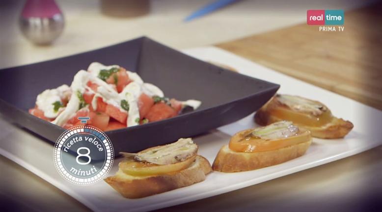 Ingredienti per 4 persone: 2 fette di anguria, Stracciatella qb, 1 ciuffo di basilico, Sale, Olio. Per i crostini: 1 baguette, 4 pomodori perini, 8 acciughe fresche, Sale, Olio.