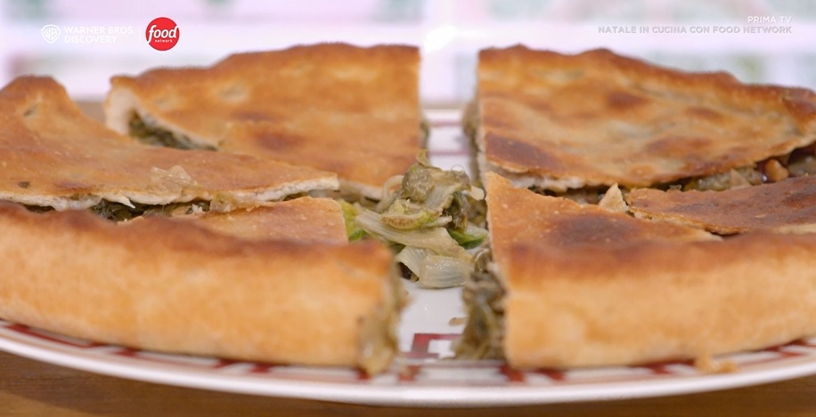 Stendiamo un panetto all’interno di una tortiera da 22 cm ben oliata. Disponiamo sopra il ripieno di scarole e copriamo con il secondo disco di impasto, sigillando bene i bordi. Ungiamo la superficie con l’olio e cuociamo in forno caldo e statico a 250° per 10 minuti; e ancora a 200° per 20 minuti.