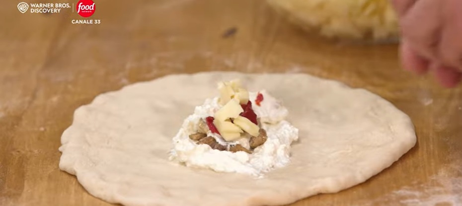 Preleviamo una pallina per volta, la stendiamo sul piano infarinato, con le mani, fino ad ottenere un disco sottile anche sui bordi. Al centro di ogni disco mettiamo la farcitura: ricotta, ciccioli di maiale, un cucchiaino di concentrato di pomodoro e dei dadini di provola affumicata, pepe macinato se gradito. Ripieghiamo l’impasto sul ripieno, a mezzaluna, facendo uscire tutta l’aria e pressando per bene con i pugni sui bordi.