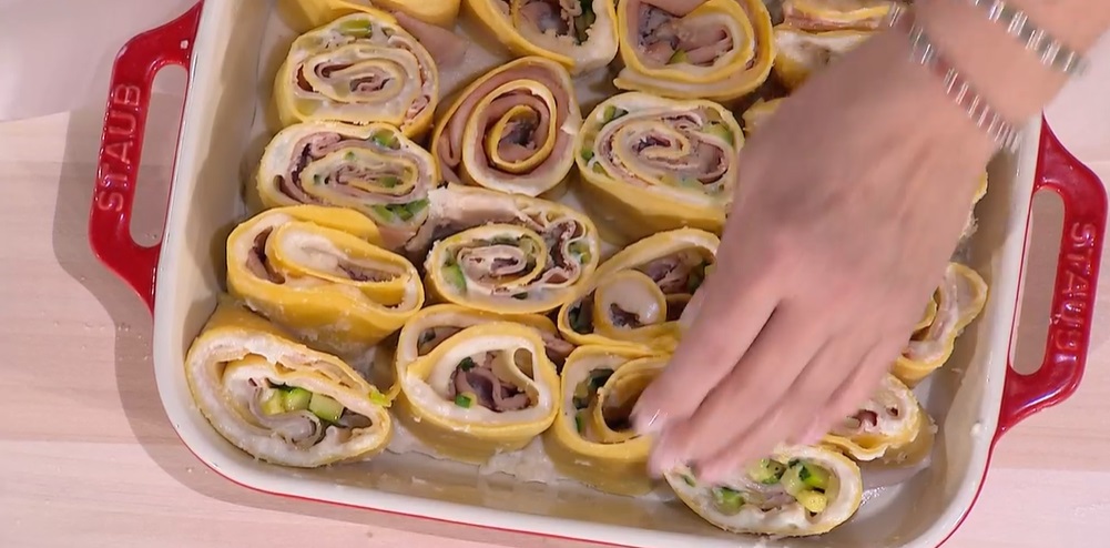 Su ogni sfoglia, spalmiamo la besciamella ed adagiamo sopra il prosciutto affettato, la fontina a fette, le zucchine a dadini e già rosolate in padella con olio ed aglio e del formaggio grattugiato. Arrotoliamo la sfoglia sul ripieno, partendo dal lato corto. Lasciamo riposare in frigorifero il rotolo ottenuto. Tagliamo quest’ultimo a fette larghe circa 5 cm.