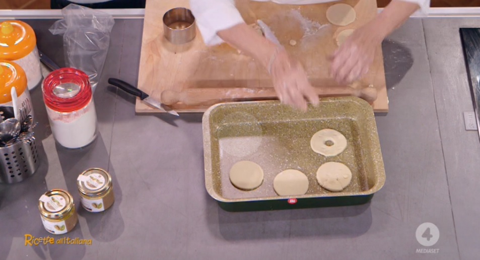 Stendiamo la frolla su un piano infarinato, utilizzando il mattarello, ad uno spessore di 3-4 mm. Ricaviamo dei dischetti delle stesse dimensioni. A metà dei dischetti ottenuti, pratichiamo un foro centrale con un levatorsolo o un coppapasta più piccolo. Disponiamo i biscotti su una teglia e cuociamo in forno caldo e statico a 160° per 15 minuti circa; devono dorarsi appena ai bordi. Lasciamo raffreddare completamente.