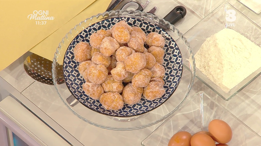 Formiamo dei quadrati di carta forno grandi come la pentola dell’olio. Formiamo su questi quadrati dei ciuffi di impasto (come bignè). Portiamo l’olio profondo a 170° ed immergiamo il foglio di carta forno con i bignè. Eliminiamo la carta e lasciamo friggere fino a doratura. Scoliamo e, ancora calde, le passiamo nello zucchero semolato. Si possono farcire con delle creme: spalmabili, pasticcera, confetture ecc.