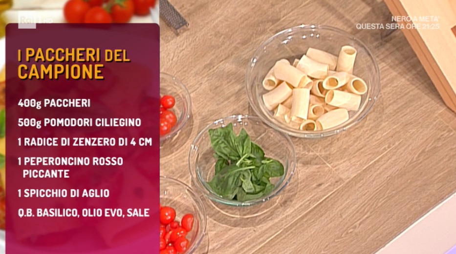 - 400 g paccheri, 500 g pomodori ciliegino, 1 radice di zenzero di 4 cm, 1 peperoncino rosso piccante, 1 spicchio di aglio, basilico, olio evo, sale
