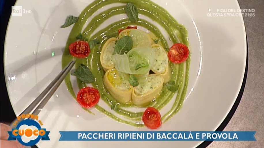 Cuociamo i paccheri in acqua salata. Li scoliamo al dente e li immergiamo in acqua fredda. Li scoliamo ancora e li facciamo asciugare su un canovaccio. Li farciamo con il composto di baccalà e provola. Inforniamo per 5 minuti a 180°.