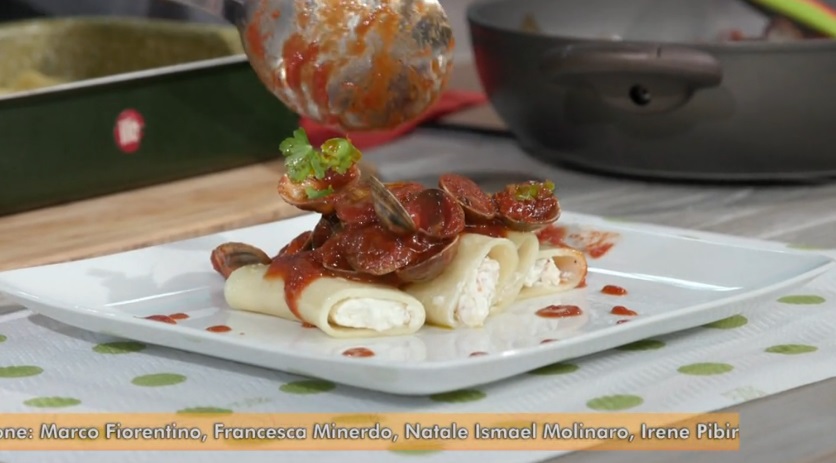 - 16 paccheri, 400 g ricotta di pecora, 200 g gamberetti, 200 g vongole, 200 g passata di pomodoro, 2 spicchi d’aglio, 5 cl vino bianco, olio, sale e pepe