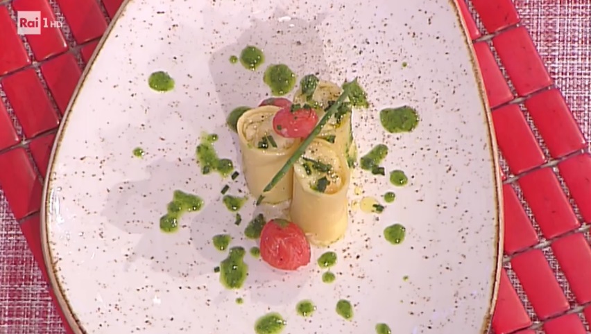 Serviamo i paccheri su uno specchio di salsa di rucola e finiamo con i pomodorini e del basilico.