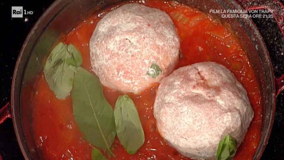 Preleviamo un pugno di impasto per polpette. Lo allarghiamo su una mano unta (come si fa con le arancine) e mettiamo al centro un po’ del ripieno al radicchio. Richiudiamo l’impasto per polpette sul ripieno, sigillandolo bene all’interno. Passiamo le polpettone nella farina e le mettiamo a cuocere nel sugo di pomodoro. Copriamo e lasciamo cuocere circa 40 minuti a fuoco lento.