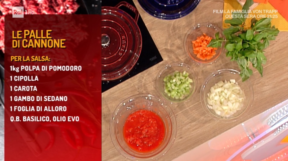 - Sugo: 1 kg polpa di pomodoro, 1 cipolla, 1 carota, 1 gambo di sedano, 1 foglia di alloro, basilico, olio