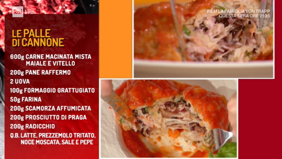 - 600 g carne macinata mista maiale e vitello, 200 g pane raffermo, 2 uova, 100 g formaggio grattugiato, 50 g farina, 200 g scamorza affumicata, 200 g prosciutto di Praga, 200 g radicchio, latte, prezzemolo, noce moscata, sale e pepe