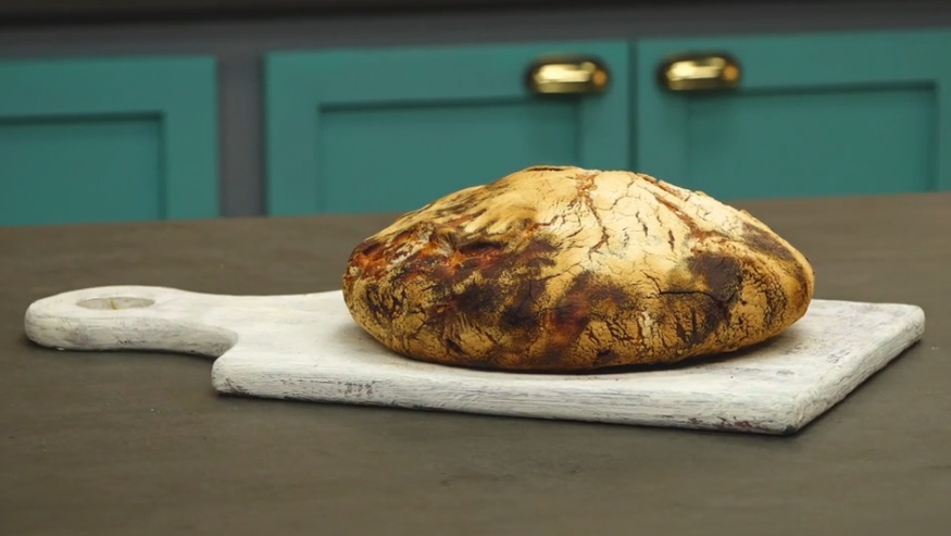 Trasferiamo l’impasto lievitato su un piano infarinato e, con le mani infarinate, pieghiamo i lembi esterni verso il centro. Trasferiamo la pasta ottenuta all’interno di una ciotola foderata con un canovaccio infarinato. Ci aiutiamo con una spatola. Copriamo con un canovaccio e lasciamo lievitare ancora 2 ore. Dopo 1 ora e mezza, mettiamo una pentola di ghisa in forno. Dopo mezz’ora, la tiriamo fuori dal forno e inseriamo all’interno la pagnotta lievitata. Copriamo con il coperchio e facciamo cuocere in forno per 30 minuti. Togliamo il coperchio e lasciamo cuocere ancora 15 minuti. Una volta cotto, lo lasciamo raffreddare.