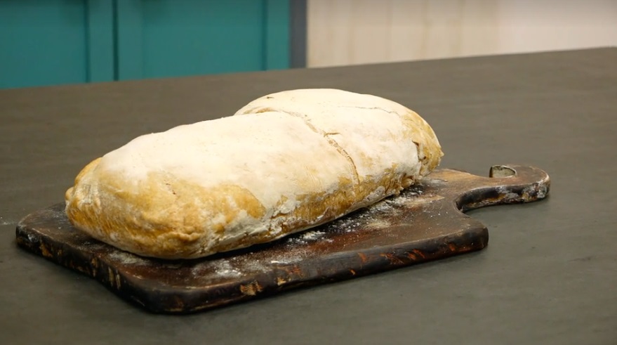 Adagiamo delicatamente il filone lievitato su una teglia con carta forno. Fate attenzione, poichè rischiate di ‘sgonfiare’ il pane. Cuociamo in forno preriscaldato a 220° per 45 minuti.