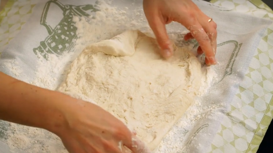 A questo punto, preleviamo 150 g del lievito madre rinfrescato (quello rimasto lo mettiamo in un barattolo ermetico, in frigorifero) e lo mettiamo in planetaria o in una ciotola. Aggiungiamo la farina e l’acqua tiepida. Impastiamo per circa 15 minuti. Lasciamo riposare qualche minuto. Spolveriamo un canovaccio con abbondante farina. Posizioniamo sopra l’impasto e lo allarghiamo leggermente, in modo da ottenere un rettangolo. Pieghiamo leggermente gli angoli verso l’interno, quindi arrotoliamo il rettangolo su se stesso, dal lato lungo. Copriamo con il canovaccio, senza stringere, e lasciamo riposare per 4-5 ore.