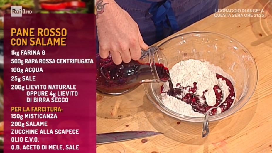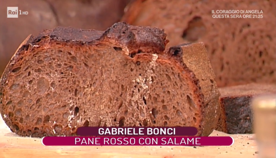 pane rosso con salameRoma è protagonista, in studio e a tavola, con le proposte di Pascucci e di Gabriele Bonci. Il pizzaiolo romano, maestro della panificazione, ci spiega come preparare il pane in casa, fragrante e… colorato! Ecco il pane rosso con salame.