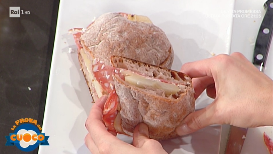 Ezio Marinato, il paninaro creativo del programma, propone uno dei suoi paninazzi da perdere la testa. Utilizza un pane al vino e succo d’uva e lo farcisce con ogni ben di Dio.