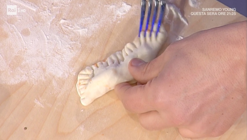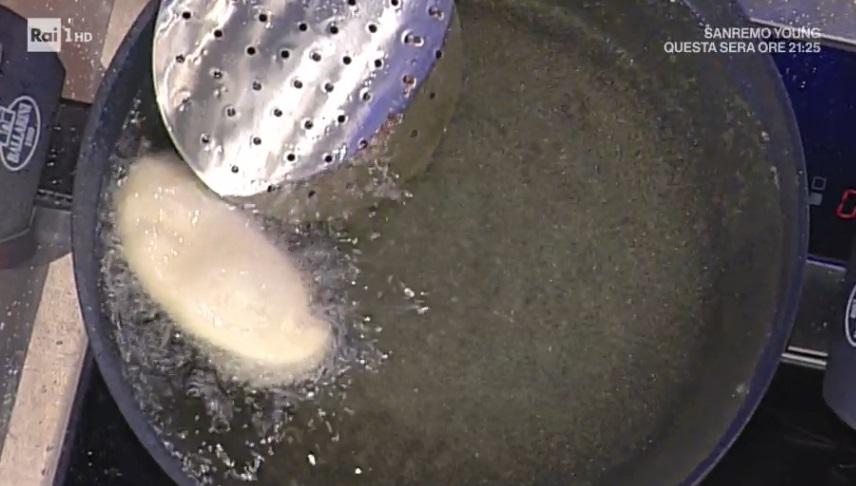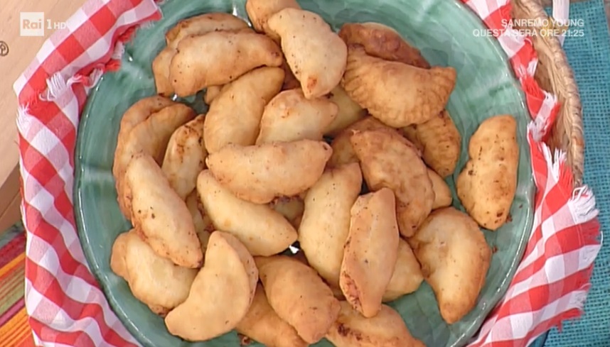 Ricaviamo dall’impasto delle palline. Le stendiamo con il mattarello. Mettiamo al centro di ogni disco un cucchiaino di ripieno. Richiudiamo l’impasto a mezzaluna e sigilliamo bene i bordi con una forchetta. Friggiamo in olio già caldo a 180°. Una volta dorati, li facciamo scolare su carta assorbente. Saliamo e serviamo caldi!