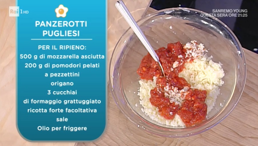 - Ripieno: 500 g mozzarella asciutta, 200 g pomodori pelati a pezzettini, origano, 3 cucchiai di formaggio grattugiato, ricotta forte facoltativa, sale