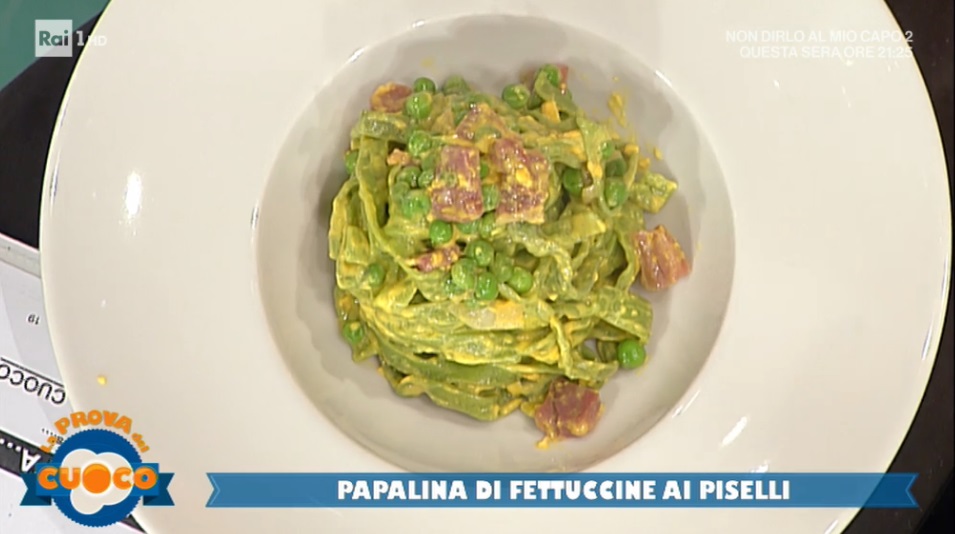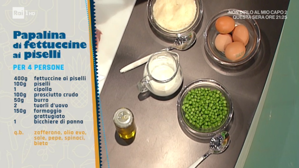 - 400 g fettuccine ai piselli, 100 g piselli, 1 cipolla, 100 g prosciutto crudo, 50 g burro, 2 tuorli, 150 g formaggio grattugiato, 1 bicchiere di panna, zafferano, olio evo, sale, pepe, spinaci, bieta