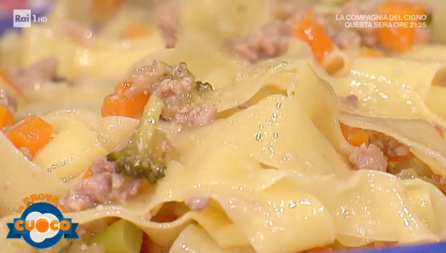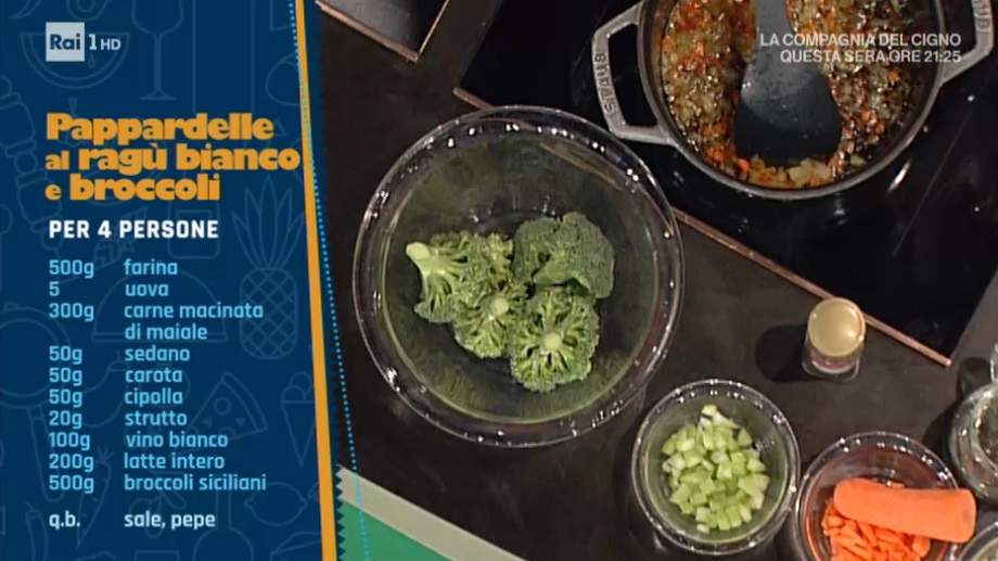 - 500 g farina, 5 uova, 300 g carne macinata di maiale, 50 g sedano, 50 g carota, 50 g cipolla, 20 g strutto, 100 g vino bianco, 200 g latte intero, 500 g broccoli siciliani, sale e pepe