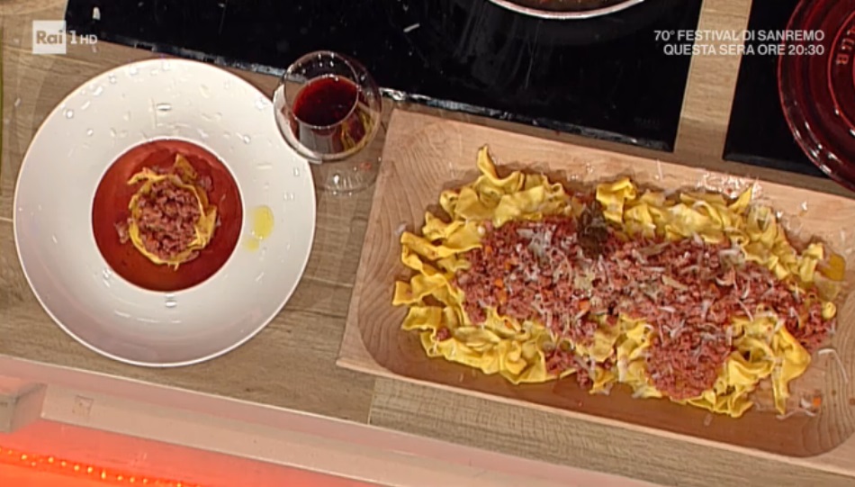 Cuociamo le pappardelle in acqua bollente e salata per pochi minuti, quindi le scoliamo e le condiamo con il ragù e delle scaglie di pecorino.