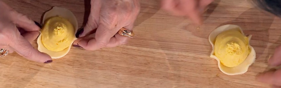 Per il ripieno, lavoriamo la ricotta ben sgocciolata con la scorza grattugiata di arancia e di limone, uniamo lo zafferano, il tuorlo d’uovo, lo zucchero semolato e mescoliamo bene: aggiungiamo la semola se il composto risulta troppo molle (vedi consiglio sotto). Trasferiamo il tutto in una sacca da pasticcere e mettiamo al centro di ogni dischetto di sfoglia abbondante ripieno. Ripieghiamo i lati sul ripieno, a cestino, pizzicando per 6 volte i lati. Li mettiamo su una placca foderata con carta forno. Inforniamo a 180° per 35 minuti.