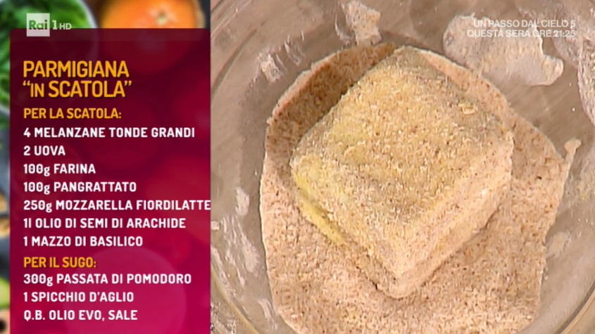 Peliamo una melanzana e la scaviamo, in modo da ottenere una sorta di scatola. La infariniamo e la passiamo nell’uovo sbattuto e nel pangrattato. Friggiamo in olio ben caldo e profondo fino a doratura, quindi asciughiamo con carta assorbente. Tagliamo a cubetti la parte scavata e la friggiamo nello stesso olio fino a doratura. La asciughiamo bene con la carta assorbente.