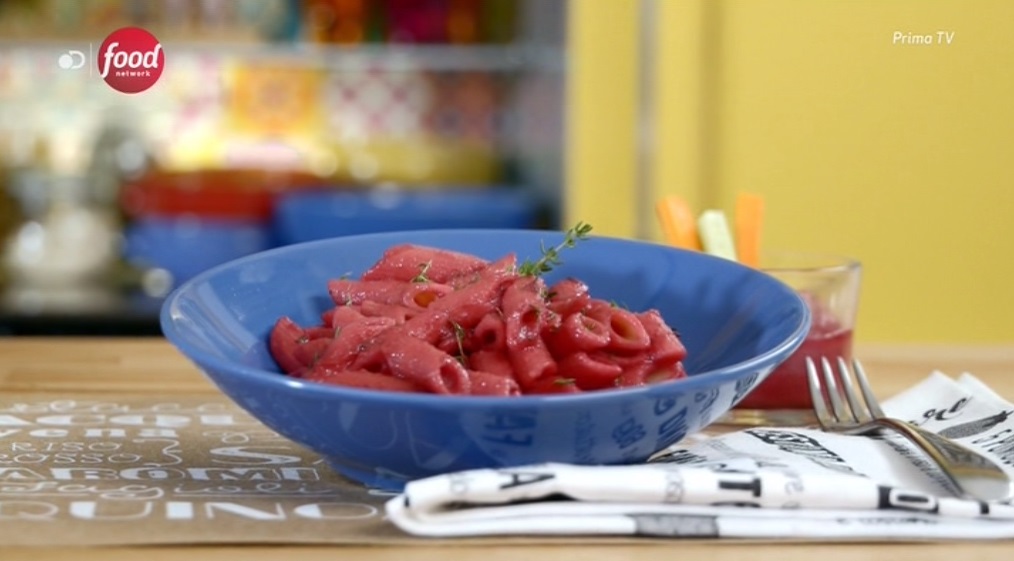 - 320 g pasta corta integrale, 250 g barbabietola lessata, 1 mazzetto di timo, 1 spicchio d’aglio, 4 cucchiai di olio evo, 2 cucchiai di pecorino grattugiato, sale