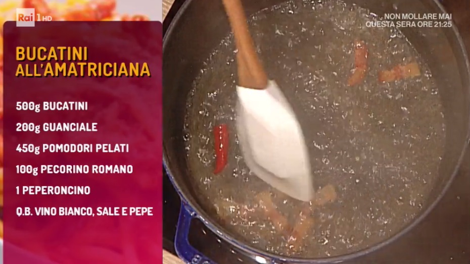 - 500 g bucatini, 200 g guanciale, 450 g pomodori pelati, 100 g pecorino romano, 1 peperoncino, vino bianco, sale e pepe
