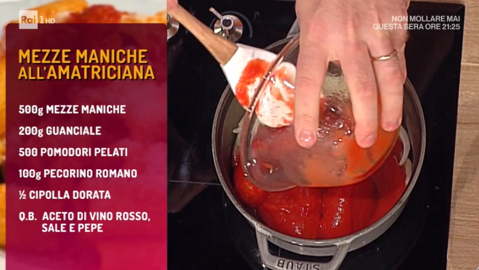 - 500 g mezze maniche, 200 g guanciale, 500 g pomodori pelati, 100 g pecorino romano, mezza cipolla dorata, aceto di vino rosso, sale, pepe
