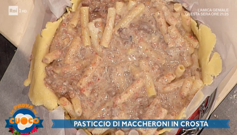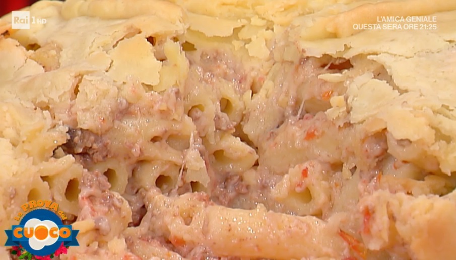 Cuociamo la pasta, dei sedani rigati, in acqua bollente e salata. Li scoliamo e li condiamo con il ragù, la besciamella ed un po’ di formaggio grattugiato. Mescoliamo e trasferiamo, quando il tutto è freddo, all’interno della crosta di briseè ancora cruda. Spolveriamo con abbondante formaggio e chiudiamo con un’altra sfoglia di briseè. Inforniamo.