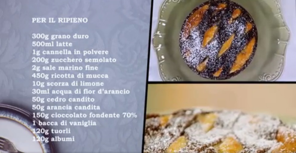 • Per il ripieno: 300 g grano duro (o precotto), 500 ml latte, 1 limone (scorza), 1 g cannella in polvere, 35 g zucchero semolato, 2 g sale marino fine, 450 g ricotta di mucca freschissima, 100 g zucchero semolato, 10 g scorza di limone grattugiata, 30 ml acqua di fior d’arancio, 50 g cedro candito, 50 g arancia candita, 150 g cioccolato fondente 70 % in pezzettini, 1 bacca di vaniglia, 120 g tuorli, 120 g albumi, 70 g zucchero semolato, zucchero a velo q.b.