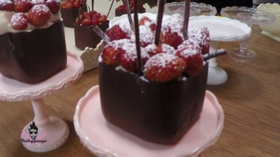Immergiamo dei cuboni di ghiaccio nel cioccolato fondente fuso. Man mano che il ghiaccio si scioglie, i cubi di cioccolato si staccheranno. Li mettiamo in freezer qualche minuto. Poi, all’interno dei cubi di cioccolato, mettiamo qualche cubetto di biscotto, uno strato di crema, ancora cubetti di pan di Spagna ed un ultimo strato di crema. Finiamo con le fragoline di bosco e delle stecche di cioccolato per decorare.
