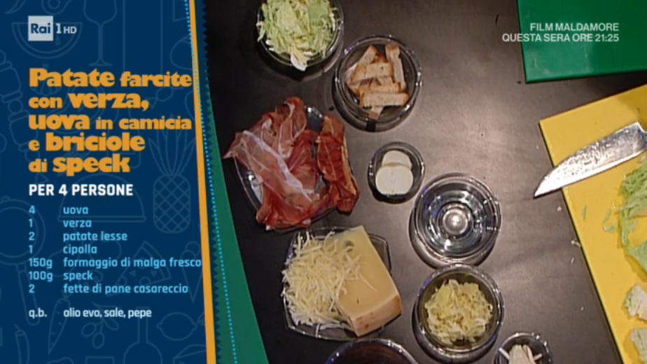 • 4 uova, 1 verza, 2 patate lesse, 1 cipolla, 150 g formaggio di malga fresco, 100 g speck, 2 fette di pane casareccio, olio evo, sale, pepe