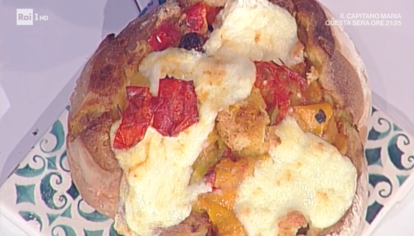 Scaviamo una pagnotta e disponiamo la stessa e la mollica su una teglia. Inforniamo per 10 minuti, in modo che diventi un po’ dorato. Sforniamo, strofiniamo il pane con le foglie di basilico fresco. Riempiamo la pagnotta con la peperonata e completiamo con il fior di latte a pezzettoni. Inforniamo nuovamente, in modo da far sciogliere il fior di latte. Usiamo il cappello della pagnotta per ‘pucciarlo’ a pezzettoni nella peperonata.
