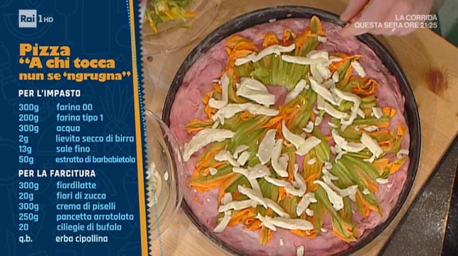 - Farcitura: 300 g fiordilatte, 20 g fiori di zucca, 300 g crema di piselli, 250 g pancetta arrotolata, 20 g ciliegie di bufala, erba cipollina