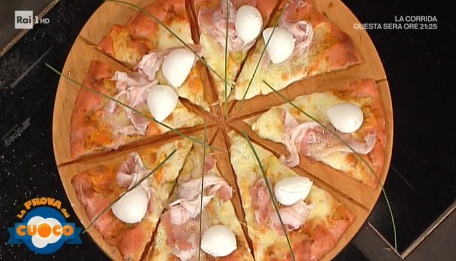 All’uscita dal forno, tagliamo a fette e condiamo ogni spicchio con la pancetta arrotolata, le ciliegine di bufala e un po’ di erba cipollina.