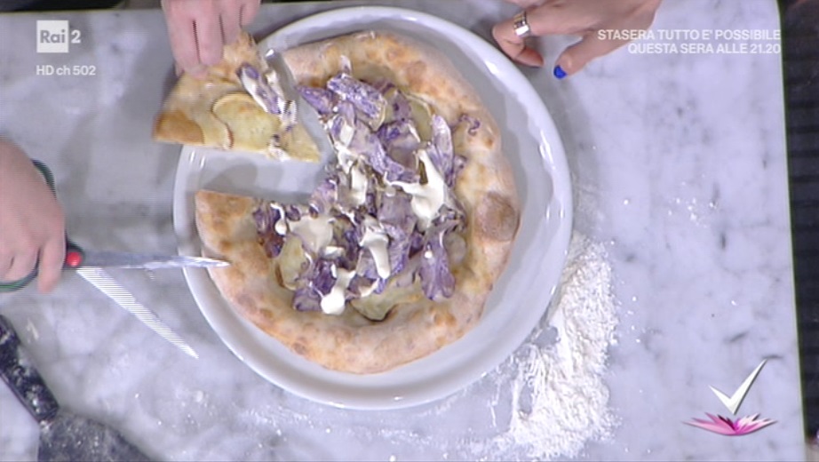 Stendiamo l’impasto lievitato e distribuiamo sopra la provola affumicata. Inforniamo su pietra lavica in forno caldo alla massima potenza. Una volta cotta, stendiamo sopra la crema di pecorino e finiamo con le chips di patate viola.