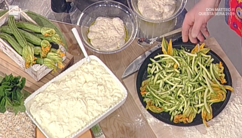 Per prima cosa, prepariamo l’impasto, seguendo la ‘solita’ ricetta (qui). Ungiamo con l’olio una teglia e la spolveriamo con sale e pepe. Disponiamo a raggiera i fiori di zucchina puliti ed aperti. Copriamo con le zucchine tagliate a listarelle.