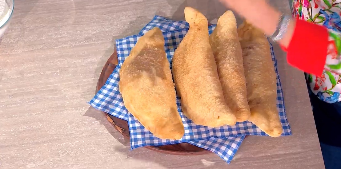Con le mani, appiattiamo ogni sfera, formando un disco sottile anche sui bordi. Su una metà, distribuiamo un po’ di ricotta, dei ciccioli di maiale, un cucchiaino di concentrato di pomodoro, provola affumicata a pezzetti, una spolverata di sale. Ripieghiamo l’impasto sul ripieno, a mezzaluna, e sigilliamo bene i bordi dando dei pugni e facendo uscire tutta l’aria all’interno. Immergiamo le nostre pizze in olio caldo e profondo, prendendole per le due estremità. Lasciamo friggere fino a doratura, rigirandole.