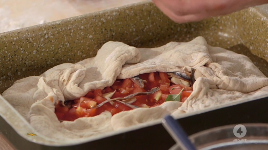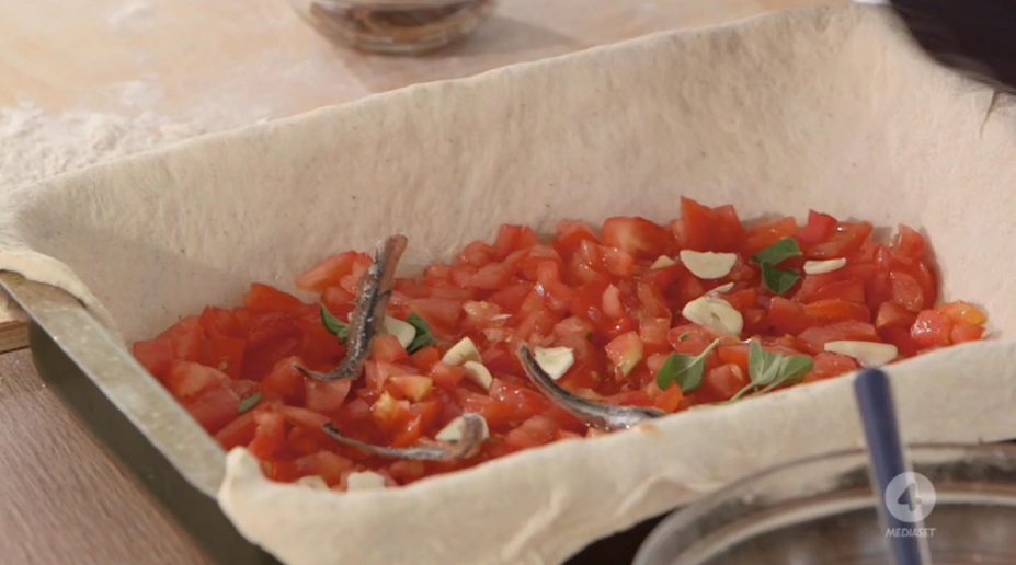 Stendiamo l’impasto lievitato su un piano infarinato, fino ad ottenere un rettangolo sottile: possiamo usare le mani o il mattarello. Lo posizioniamo su una teglia rettangolare, allungandola ulteriormente e posizionando l’eccesso della pasta sui bordi della teglia. Distribuiamo sopra la sfoglia i pomodori conditi, le acciughe sott’olio, l’aglio tritato e l’origano. Ripieghiamo i bordi della pasta sul ripieno di pomodori e li spennelliamo con un’emulsione di acqua ed olio (in parti uguali). Cuociamo in forno preriscaldato a 220° per 30 minuti.