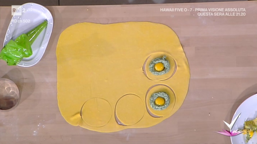 Su metà dei dischi di sfoglia formiamo delle ciambella di farcia agli spinaci. Inseriamo al centro di ogni ciambella 1 tuorlo crudo. Copriamo con un altro disco di sfoglia e sigilliamo bene i bordi, facendo uscire l’aria, con una forchetta.