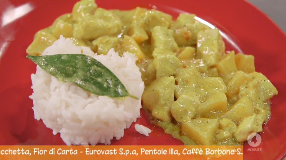 pollo al curryLa cuoca casalinga Anna Moroni, assistita da Davide Mengacci, all’interno della puntata odierna di Ricette all’italiana, il programma di Rete4 in onda dal lunedì al sabato prima e dopo il Tg4, ha preparato il pollo al curry con le mele.