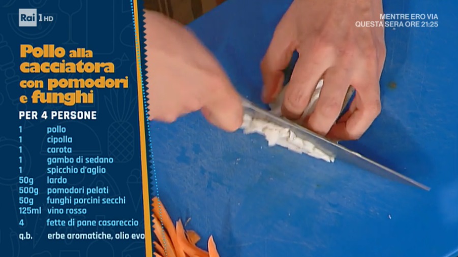 - 1 pollo, 1 cipolla, 1 carota, 1 gambo di sedano, 1 spicchio d’aglio, 50 g lardo, 500 g pomodori pelati, 50 g funghi porcini secchi, 125 ml vino rosso, 4 fette di pane casareccio, erbe aromatiche, olio evo